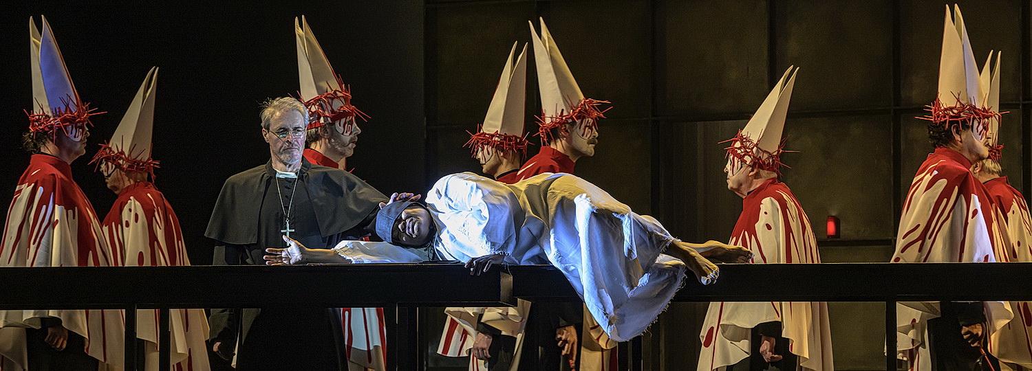 Der Verdi-Spezialist Will Humburg am Pult des Beethoven-Orchesters Bonn bringt mit energi­schem Dirigat und stetigen Einfluss nehmendem Kontakt zu den Akteuren auf der Bühne das Klang­ge­mälde der Partitur prachtvoll zum Erblühen. Das weitge­spannte Panorama an musika­li­schen Farben, die martia­li­schen Takte, die Taran­tella- und weiteren Tanz-Rhythmen, die lyrisch verin­ner­lichten Sequenzen. Der Opernchor, akkurat einstu­diert von André Kellinghaus, agiert vorbildlich, sei es in der anspruchs­vollen Dimension der Gesänge, sei es darstel­le­risch als Soldaten, Mönche, Bettler. Auch sie reprä­sen­tieren eine Macht, die der kollek­tiven mensch­lichen Stimme.