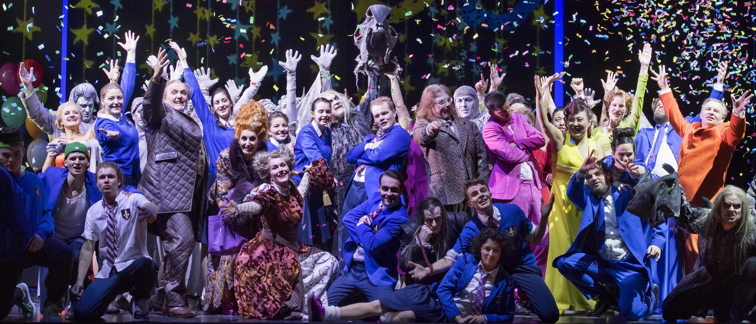 Zum großen Finale haben sich alle eingefunden, die in den knapp zwei Stunden Opernkino zuvor die Geschichte des Internatszöglings und Halbwaisen Jon Whitcroft und seiner Schulfreundin Ella Littlejohn erzählt haben. Vereint an der Rampe sind nun Gute und Böse, hier Gestalten, die dem Publikum in der Oper Bonn einen Schauer nach dem anderen über den Rücken gejagt haben, dort die anderen mit der Fähigkeit, es zum Schmunzeln, manchmal gar zum Lachen zu bringen. Allen voran die zumeist recht skurrilen Figuren aus der Sippschaft der jungen Helden, dazu die surrealen Ritter aus dem Mittelalter, ferner allerlei Fantasy-Personal wie Dämonen und Kröten. Wie Watte legt sich ein Harmonien beschwörender Breitband-Soundtrack über die Szene. „Kitsch, Kitsch, Kitsch“, wird dazwischen gerufen. Nun ist Rap von Seiten der drei Kröten angesagt, mit dem die Uraufführung des „Opernthrillers“ Geisterritter von James Reynolds nach dem Roman von Cornelia Funke endet.