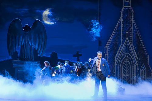 „Kinder sind manchmal sehr viel offener als die Erwachsenen, sie sind an neuen Klängen und Spieltechniken interessiert“, sagt Reynolds vor der Uraufführung. „Sie hören mit den Augen.“ Diese Erkenntnis bringt Regisseur Erik Petersen visuell mit einer spektakulären Inszenierung der Schauergeschichte zur Geltung. Der dritte Glücksfall: Petersen weiß mit dem Ausstatter-Team Momme Hinrichs und Torge Møller Bündnisgenossen an seiner Seite, die der fantastischen Funke-Story adäquate Bilderwelten zugesellen. Wie das Duo, 2014 in Bonn bei Verdis Giovanna d‘Arco erstmals voll für eine Inszenierung verantwortlich, die rasch, weil ohne Umbaupausen wechselnden Schauplätze herbeizaubert, ist Videokunst par excellence, innovativ und verblüffend. Diese Phantasmagorie entsteht just in time, wenn sich das Klassenzimmer des Internats zum Beispiel in die Kathedrale von Salisbury verwandelt, später dann in den Friedhof zu Kilmington, wo – oh Wunder – Gräberskulpturen zu kämpfenden Rittern werden, natürlich auf der Seite des Guten. Dass die Märchenwelt der Funke höchst unterhaltsam funktioniert, ist nicht zuletzt den prächtigen Kostümen zu verdanken, die Kristopher Kempf eingebungsvoll konzipiert hat.