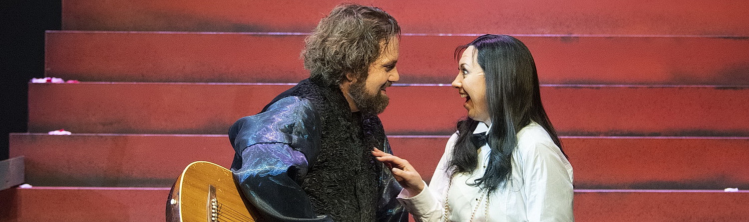 Diesen Dichter, den Poeten wie den Trunkenbold ein Bruder des Falstaff in der Kunst, inter­pre­tiert Mirko Rosch­kowski mit Spielwitz und raumgrei­fender Stimme, nur dass er eben in einer anderen Lage singt. Sein Tenor ist ausdrucks­stark, flexibel im Parlando und strahlend in der Höhe. Keine 48 Stunden nach seinem heraus­ra­genden Auftritt als Fernand Cortez in Spontinis heroi­scher Oper in Dortmund macht er die Partie des Li-Tai-Pe zu seiner Rolle, indirekt in den Spuren großer Vorgänger. Julius Patzak etwa gestaltet den Part 1930 in einer Münchner Aufführung. Anna Princeva hat große Auftritte als Darstel­lerin der Yang-Gui-Fe, die in der Verkleidung als Page die Geschichte in Richtung happy end wendet. Ein Höhepunkt ist Einsam steht und regungslos an des Stromes Ufer, das in Strophen geglie­derte Lied über den Kormoran, das der Komponist auch als Orches­terlied veröf­fent­licht. Vorzüglich harmo­niert sie im Liebes­duett mit Rosch­kowski. Ihre berüh­rende Perfor­mance wird leider durch ein gegen Ende zuneh­mendes Vibrato geschmälert, das struk­tu­relle Gründe haben mag.