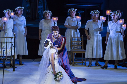 Gleiches gilt auch für die in Bonn beliebte Gastsängerin Anna Princeva, die Roschkowski eine passend attraktive Bühnenpartnerin ist. Ihre Elsa ist perfekt ausbalanciert zwischen einer fast autistischen Träumerei und einer nach außen gerichteten Stimme, die das Publikum erreicht. Ihr Sopran klingt in allen Lagen gleichmäßig und sie führt ihn mit einer technischen Sicherheit, die ihr allerschönsten femininen Wohlklang, aber auch schärfenfreie Aufschreie erlauben. Dass lässt aber auch die Frage aufkommen, wie sie sich gleichzeitig auf der Bühne so natürlich und ungekünstelt bewegen kann. Eine großartige Gegenspielerin mit einer umwerfenden Bühnenpräsenz ist ihr Dshamilja Kaiser in der Rolle der Ortrud. Auch hier ist es kaum zu glauben, dass das ein Rollendebüt ist. Kaiser spielt keine kreischende femme fatale, sondern eine überzeugte Anhängerin eines heidnischen Glaubens, die mit bösartiger Ruhe ihre Pläne verfolgt. Die Mezzosopranistin behält sie auch bei den gefürchteten Einsätzen Entweihte Götter und Fahr heim du stolzer Helde, die sie mit dramatischer Attacke in den Raum schleudert.