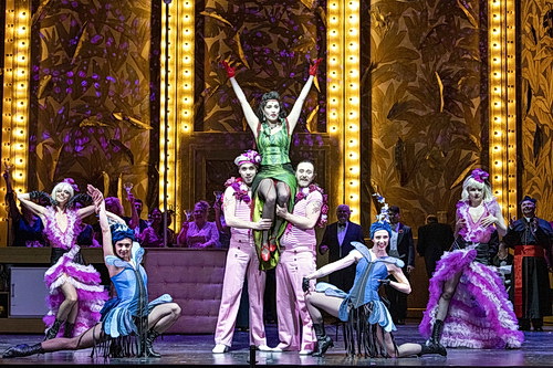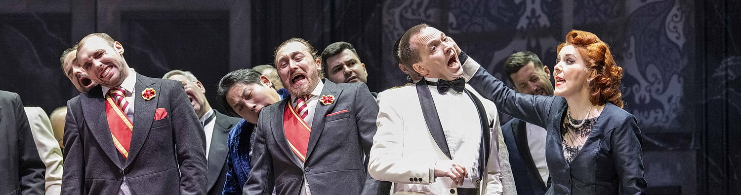 Auch die Gestaltung der weiteren Szenerie – der Salon im pontevedrinischen Gesandtschaftspalais sowie das Schloss der Glawari – schwelgt wie die opulenten Kostüme von Franziska Jacobsen in der Adaption einer Epoche, in der Vaudeville-Weisen, Can-Can und Walzer den Ton angeben. In der Grisetten, später die petites femmes in den Clubs der Aristokraten, mit ihren erotisch konnotierten Tänzen die Klassenunterschiede zu verwischen suchen. Da geh’ ich zu Maxim, kündigt Graf Danilo in einer der vielen populären Nummern der Partitur Lehárs an. Doch der Lebemann und Lebenskünstler Danilo geht eben nicht nur in das 1893 von einem gewissen Maxime Gaillard gegründete Etablissement. Er entzieht sich auch samt obligatem Smoking, Schal und Zylinder den Zwängen des Alltäglichen. Die Galanterie des schönen Scheins erreicht ihren Höhepunkt.