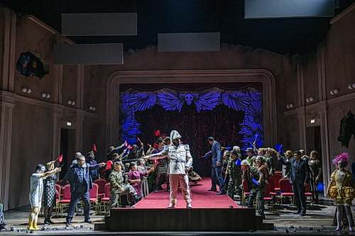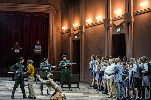Im zweiten Akt nach einem Umbau auf offener Bühne während der Pause gastiert eine Theatertruppe in der Ruine, die jetzt als Militärkrankenhaus dient. Soldaten, Verwundete, Besatzer versprechen sich Abwechselung vom Terror des Krieges von einer Aufführung die von der Frau mit Peitsche, Manon Greiner, organisiert wird. Gegeben wird eine Operngroteske im Stil einer italienischen Romanze mit Anklängen an Giuseppe Verdi und Giacomo Puccini. Kern ist Angelo, Tae Hwan Yun, ein italienischer Patriot, in unerfüllter Liebe zu Silvana, Katerina von Bennigsen, die sich ebenfalls aus Patriotismus auf eine Ehe mit dem Marquis von Prudhon, Giorgos Kanaris, dem von Napoleon eingesetzten Vizekönig von Italien, eingelassen hat. Am Ende liegen alle Protagonisten tot am Boden, auch der Angelo-Freund Sandro, Tianji Lin, und Lucia, Angelos Mutter, Ava Gesell. Hingestreckt von Pistolenkugeln von Verrätern.