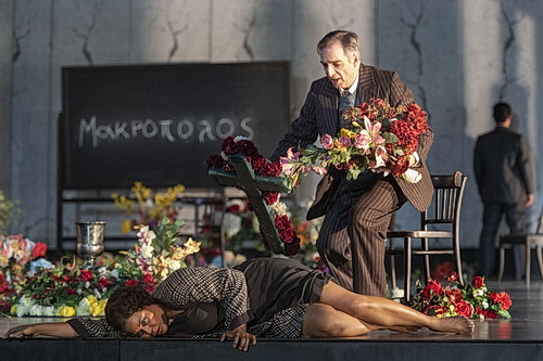 Auch wenn Die Sache Makro­pulos, das Stück wie die Causa bei Gericht, in gerade einmal zwei Stunden ausge­standen ist, verlangt sie ungeachtet der vorzüg­lichen Übertitel von Julia Kluxen-Ayissi dem Publikum ein hohes Maß an Konzen­tration ab. Das lässt sich vielleicht indirekt auch aus den deutlichen Lücken im Parkett ableiten, was für eine Premiere im Bonner Haus schon ungewöhnlich ist. Am Ende verschwindet dieser Eindruck angesichts des Jubels, der deutlich mehr ist als der Comme-il-faut-Applaus, wie Peter Gülke einmal die Höflich­keits­re­aktion des Publikums genannt hat. Höflichkeit? Fürwahr, in der Publi­kums­re­aktion vollzieht sich vieles mehr, vielleicht sogar Stolz auf eine wirkliche Ensembleleistung.