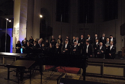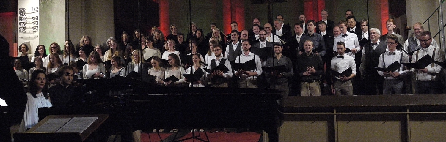 Dann übernimmt der WDR-Rundfunkchor mit seinem Leiter Robert Blank am Pult. Souverän und routiniert erklingen bei vierhändiger Klavierbegleitung die Liebeslieder-Walzer von Johannes Brahms mit Texten von Georg Friedrich Daumer, ursprünglich gesetzt für vier Singstimmen und Klavier vierhändig. Auch hier „durchrauscht“ ganz wonnig „ein Vöglein die Luft“. Was sich danach ereignet, ließe sich als Spontanvernetzung oder auch joint venture beschreiben. Jedenfalls wird es eng auf dem niedrigen Podium. Vier der Liebeslieder werden von beiden Chören interpretiert: Es bebet das Gesträuche, Rede, Mädchen, allzu liebes, O die Frauen und Wie des Abends schöne Röte. Die Ensembles harmonieren erstaunlich. Ein Eindruck, der im Grunde ein Riesenkompliment an die Bonner „Laienschar“ bedeutet.