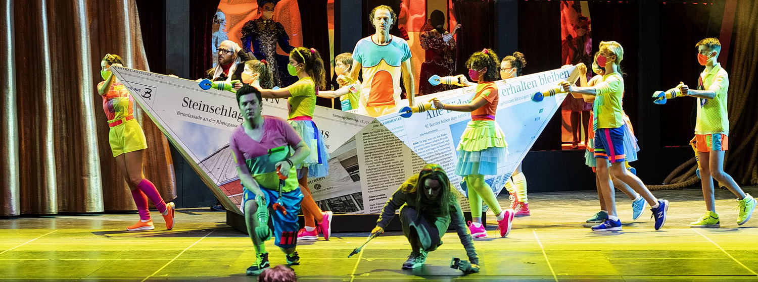 Die Umsetzung von Staats­theater ist in Bonn dem Regisseur Jürgen R. Weber anver­traut, was sich im Verlauf des 100-Minuten-Abends als eine heikle Lösung erweist. Weber, Regisseur und Autor von TV-Serien vor seiner Arbeit als Opern­re­gisseur –zuletzt Marx in London von Jonathan Dove 2018 in Bonn – gibt den Bonn-Bezügen übermäßig viel Raum. Der eigentlich inten­dierten Reflexion über „richtige“ oder „falsche“ Opern­in­sze­nie­rungen nimmt er somit Etliches an Aufmerk­samkeit. Lokal mögen Verweise auf die latenten Bonner Finan­zie­rungs­que­relen Sport versus Oper oder umgekehrt reizvoll sein, auf der Bühne wie auch als neckische Aktion im Foyer. Zur Vermittlung der ambitio­nierten Sache tragen sie nichts bei. Auch nicht das dekorative Zeitungs­schiff, das sich Hank Irwin Kittel für das Bühnenbild hat einfallen lassen.