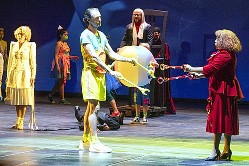 „Genetisch“ bedingt liegt dem Ganzen keine klassische Partitur zugrunde, sondern ein viele Hundert Seiten umfas­sendes Logbuch von präzisen Vorgaben zur Aufführung. Titel einzelner Teile wie „Ensemble für 16 Stimmen“, „Debüt für 60 Stimmen“, „Saison. Sing-Spiel in 65 Bildern“, „Freifahrt. Gleitende Kammer­musik“ lesen sich wie eine Navigation durch die Kagelsche Komple­xität. Auf der Bühne ist diese Komple­xität eine bunte Abfolge von Szenen zwischen den Polen Zirkus­zauber, Slapstick, Ballett­ein­lagen und Kika-Welt mit Kostümen von Kristopher Kempf, die mit den Standards von Oper, Ballett und Theater ihr frivoles Spiel treiben. Zu sehen gibt es Banales, Absurdes, manchmal Erbau­liches. Vor einem blauen Hinter­grund einen Sprungturm, wie er in jedem Schwimmbad zu beobachten ist. Dann ein in Quer- und Längs­linien geteiltes Gestell, das sich durch Drehung in ein Theater im Renais­sancestil wandelt.