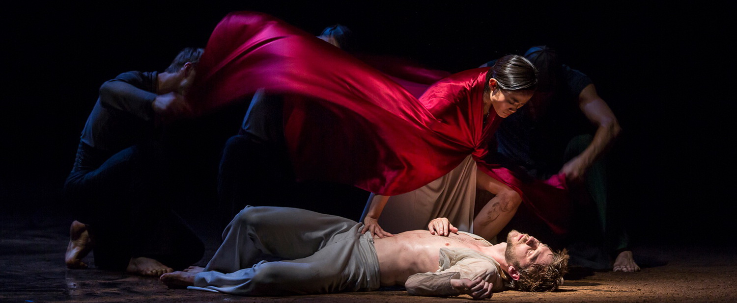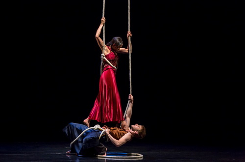 Dass eine von gesellschaftlichen Zwängen befreite Liebe in dieser Gesellschaft nicht möglich ist, führt die getanzte Version mit Hilfe dieses Kunstgriffs noch deutlicher vor Augen als manche Opernproduktion. Und wenn sich Isolde an ein Schiffsseil bindet, um Halt zu finden, nutzt Joëlle Bouvier diese simple Requisite für einen ganzen Kanon von Verwendungsnuancen. Das Seil bietet Halt, erweist sich aber auch Fessel, es hilft Isolde, Tristan an sich zu binden und es erlaubt ihr, sich daran weit über die enge reale Welt zu schwingen und wenigstens für Augenblicke den Boden unter den Füßen zu verlieren. In ihrem blutroten Gewand ergeben sich so Bilder von ergreifender Schönheit, die Madeline Wong zusammen mit Geoffrey van Dyck als Tristan ebenso anmutig wie kraftvoll in Bewegung umsetzen. Und gestorben wird in verklärender Schönheit.