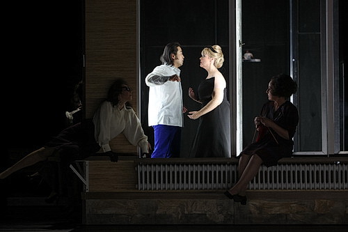 Ständig hängt jemand am Glimmstängel. Zigaretten, hier Fakes, werden zu den passenden wie den unpassendsten Momenten gereicht. Ein Momentum, das Stöppler auch gegen die Musik behauptet. Nach ihrer Wahnsinnsarie im vierten Akt wird Lady Macbeth übergangslos eine angezündete Zigarette angedient. So kräfteraubend, wird womöglich suggeriert, kann der Auftritt folglich nicht gewesen sein.