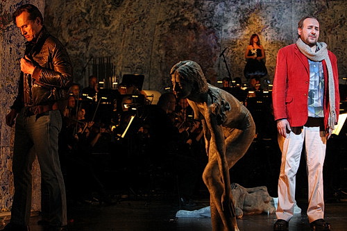 Die Szene wird weiterhin durch das im hinteren Bühnenraum platzierte Orchester geprägt. Was zunächst als reine Notwen­digkeit, über 70 Musiker einschließlich Klavier, Celesta und Harmonium überhaupt platzieren zu können, geboten ist, bewirkt schließlich ein ganz beson­deres künst­le­ri­sches Wirkungs­element. Die durch den hochge­fah­renen Orches­ter­graben unmit­telbar vor dem Publikum agierenden Protago­nisten sowie die Video­se­quenzen werden durch die Klang­magie der Korngold-Partitur gleichsam klang­ma­le­risch und psycho­lo­gisch durch­leuchtet. Dabei passt der durch das offen spielende Orchester unmit­tel­barere Klang der Instru­mente bestens in das Konzept dieser hinter­fragten Spätro­mantik als der oft wohlig-vermischte Klang aus dem Graben.
