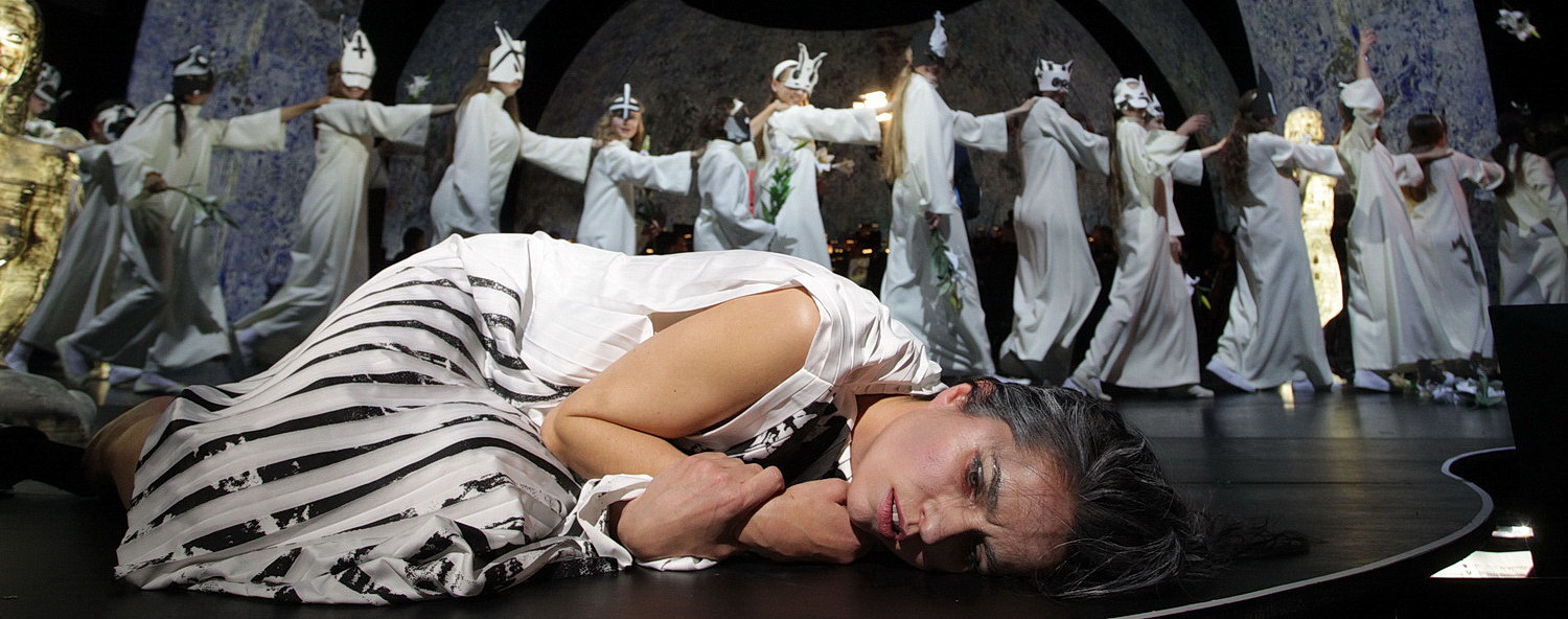 Paul sieht sie ausschließlich als Marie, er kann ihr keine eigene Persön­lichkeit zuerkennen. Als Marietta das immer stärker einfordert, wird mehr und mehr deutlich, dass Paul und Marietta sich aus gänzlich gegen­sätz­lichen Welten zu erreichen versuchen und daran scheitern. Die Video­ein­spie­lungen zeigen stilis­tische Elemente der 1970-er und 80-er Jahre und nehmen Bezug auf die Frauen­be­wegung der Zeit. Als Marietta mit ihrer Tanzgruppe immer ausschwei­fender, diony­si­scher tanzt, weiß sich Paul nicht anders zu erwehren als sie in einem Verzweif­lungsakt zu töten. Die Szene erscheint wie eine Antwort auf das rausch­hafte, entgrenzte Taumeln der orgias­ti­schen Gruppe, das sich im Video wie auf der Bühne bis an die Grenze der Selbst­aufgabe in eine kultische Handlung hinein­zu­steigern scheint. Erst nach der Tat beginnt Paul seine eigene Handlungs­fä­higkeit zurückzugewinnen.