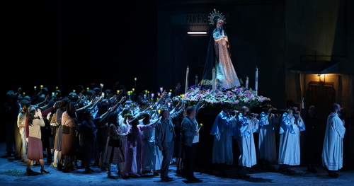 An sich ist die Bühnenwirksamkeit der Stücke so groß, dass man tatsächlich auf besonders originelle Einfälle oder Aktualisierungen verzichten und sich guten Gewissens auf das Libretto und die Musik verlassen kann. Denn das Thema Eifersucht, das in beiden Werken zum tragischen Ausgang führt, bedarf keiner verkrampften Aufpolierung. Dass neben der Kirche und der Wohnstube von Mutter Lucia in Cavalleria Rusticana auch ein Pizzabäcker fleißig den Teig rollt und es schon im Vorfeld zu heißblütigen Raufereien unter den sizilianischen Burschen kommt, selbst diese behutsame Annäherung an neuere Zeiten ist entbehrlich, stört aber auch nicht. Mit den schlichten, pseudo-realistischen Bühnenbildern von Paolo Fantin, der die Drehbühne nutzt, um die Spielorte reibungslos wechseln zu können, stellt sich ein süditalienisches Ambiente ein. Raffiniert ist die Verknüpfung beider Stücke, wenn in der Cavalleria bereits die Aufführung der Pagliacci plakatiert wird und Santuzza und Nedda im gleichen Kostüm auftreten. Aufgewertet wird die Rolle der Mutter Lucia, die ebenso viel Empathie für ihren geliebten Sohn und für die betrogene Santuzza aufbringt und von den Konflikten geradezu zerrissen wird, was gestisch fast aufdringlich überzeichnet wird. Hervorzuheben ist auch die schillernde Darstellung des intriganten Tonio in den Pagliacci, der, körperlich benachteiligt, wie eine Mischung aus Richard III. und Jago seine bösen Ränke schmiedet. Ansonsten vertraut der Regisseur dem Einsatz der Protagonisten, die aus der plastischen Kraft der Musik heraus intuitiv das Drama erstehen lassen.