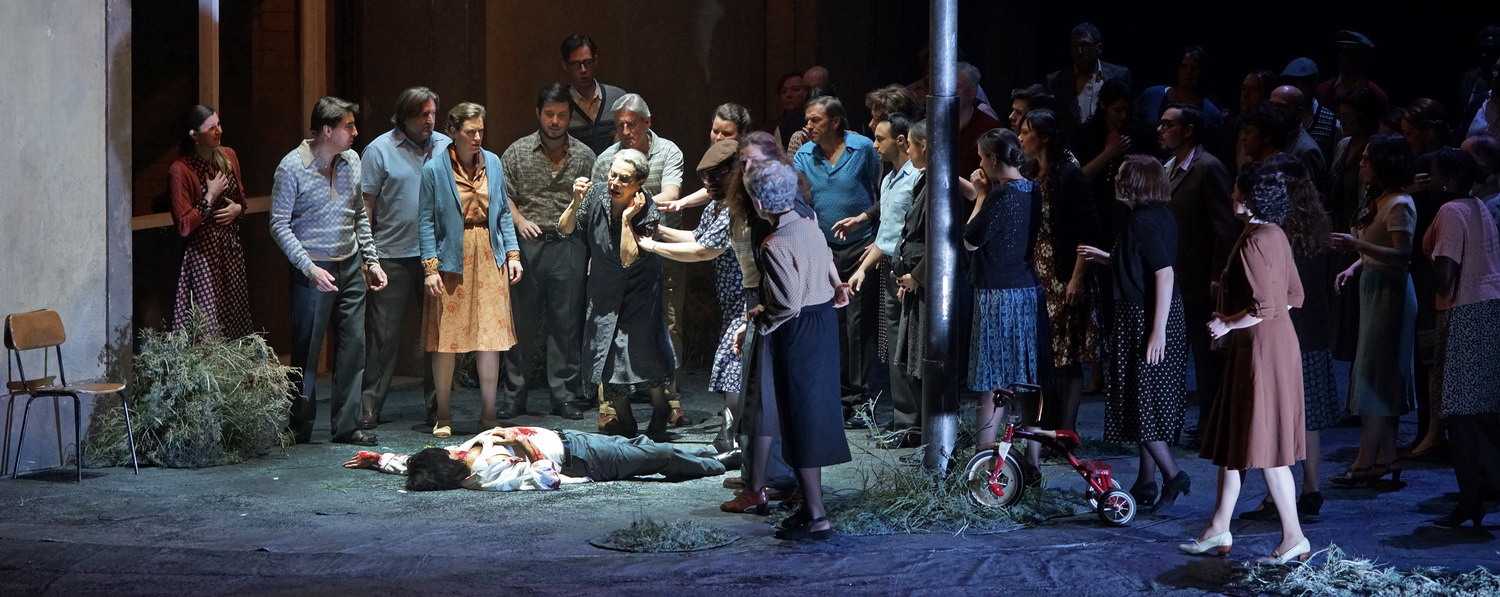 An sich ist die Bühnenwirksamkeit der Stücke so groß, dass man tatsächlich auf besonders originelle Einfälle oder Aktualisierungen verzichten und sich guten Gewissens auf das Libretto und die Musik verlassen kann. Denn das Thema Eifersucht, das in beiden Werken zum tragischen Ausgang führt, bedarf keiner verkrampften Aufpolierung. Dass neben der Kirche und der Wohnstube von Mutter Lucia in Cavalleria Rusticana auch ein Pizzabäcker fleißig den Teig rollt und es schon im Vorfeld zu heißblütigen Raufereien unter den sizilianischen Burschen kommt, selbst diese behutsame Annäherung an neuere Zeiten ist entbehrlich, stört aber auch nicht. Mit den schlichten, pseudo-realistischen Bühnenbildern von Paolo Fantin, der die Drehbühne nutzt, um die Spielorte reibungslos wechseln zu können, stellt sich ein süditalienisches Ambiente ein. Raffiniert ist die Verknüpfung beider Stücke, wenn in der Cavalleria bereits die Aufführung der Pagliacci plakatiert wird und Santuzza und Nedda im gleichen Kostüm auftreten. Aufgewertet wird die Rolle der Mutter Lucia, die ebenso viel Empathie für ihren geliebten Sohn und für die betrogene Santuzza aufbringt und von den Konflikten geradezu zerrissen wird, was gestisch fast aufdringlich überzeichnet wird. Hervorzuheben ist auch die schillernde Darstellung des intriganten Tonio in den Pagliacci, der, körperlich benachteiligt, wie eine Mischung aus Richard III. und Jago seine bösen Ränke schmiedet. Ansonsten vertraut der Regisseur dem Einsatz der Protagonisten, die aus der plastischen Kraft der Musik heraus intuitiv das Drama erstehen lassen.