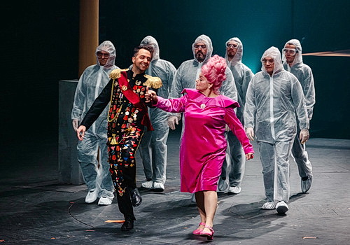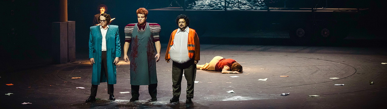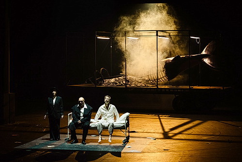 Regisseur Bence Varga füllt diesen dystopischen Ort, der eine beliebige Stadt, eine beliebige Gesellschaft in einem beliebigen Land widerspiegeln könnte, mit erschreckendem Einblick und Detailreichtum zum Leben. Botond Devichs Bühnenbilder sind minimal, aber wirkungsvoll – ein Laternenpfahl, der Container, in dem der Wal ausgestellt ist, ein Krankenhausbett – und werden durch die düstere, atmosphärische Beleuchtung von Sándor Baumgartner hervorragend unterstützt. Kostümbildner Kató Huszár lässt die Bevölkerung grau und trist aussehen im Vergleich zu den skurrilen Akzenten, die er extrovertierten Figuren wie der neu gewählten Bürgermeisterin Tünde mit ihrer rosafarbenen Hochsteckfrisur und einem von oben bis unten mit Orden bedeckten Armeeoffizier verleiht, der sich wie jemand aus Monty Pythons Ministry of Silly Walks verhält.