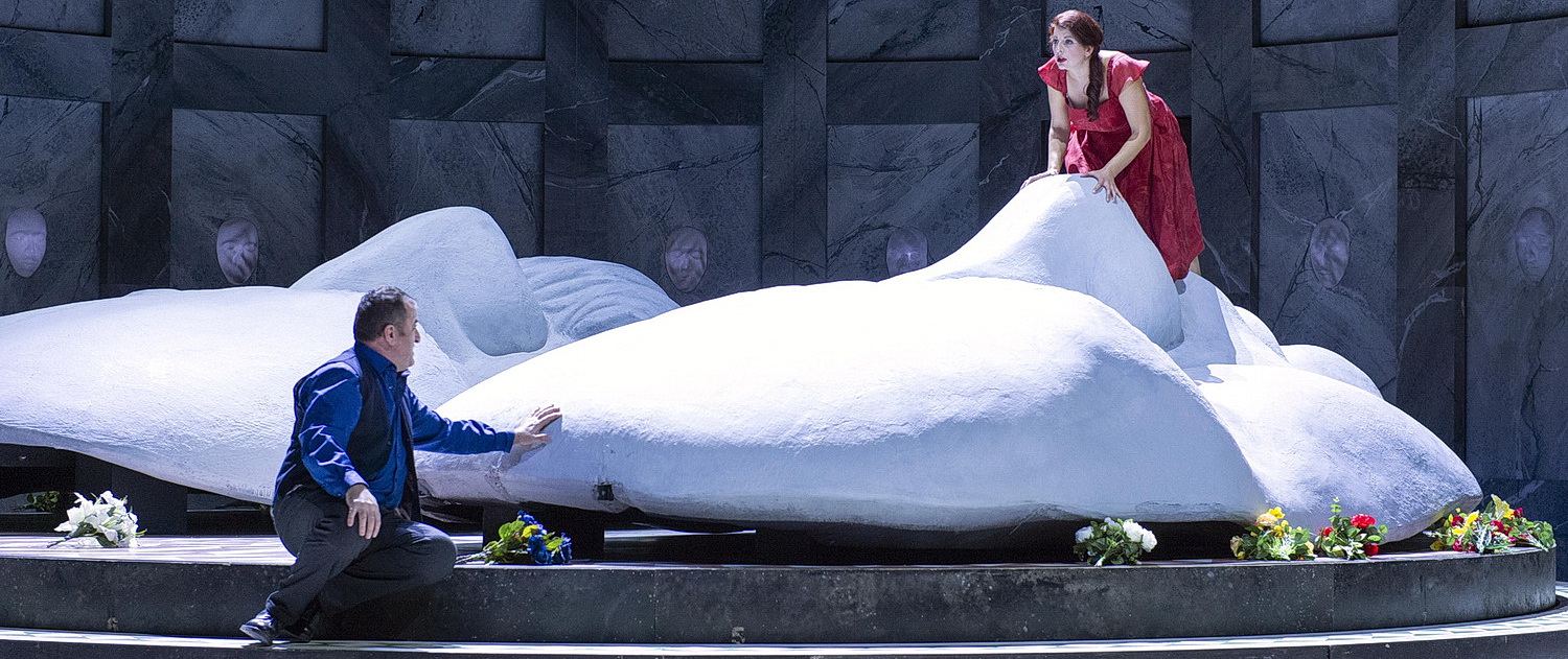 Kittel setzt richtungsweisende Impulse, indem er das Einheitsbühnenbild für beide Werke als monumentales Mausoleum anlegt mit zwei mächtigen Totenmasken der beiden Komponisten, die sich in der Cavalleria wie schwere Grabplatten absenken. Im Bajazzo bildet die Innenseite einer Maske das Zentrum der Spielfläche. Stolperanfällige Terrains für die Sänger, die sie teilweise geradezu akrobatisch bewältigen. Vor allem die streng skizzierte Handlung der frommen und gleichwohl unbarmherzigen Gesellschaft im sizilianischen Dorf Mascagnis zelebriert Montavon wie eine Totenfeier, wobei Turiddu auf den Masken wie auf seinem eigenen Grab tanzt. Ein packender Totentanz des Verismo. Einfache Ideen, brillant umgesetzt und von bestrickender Wirkung.