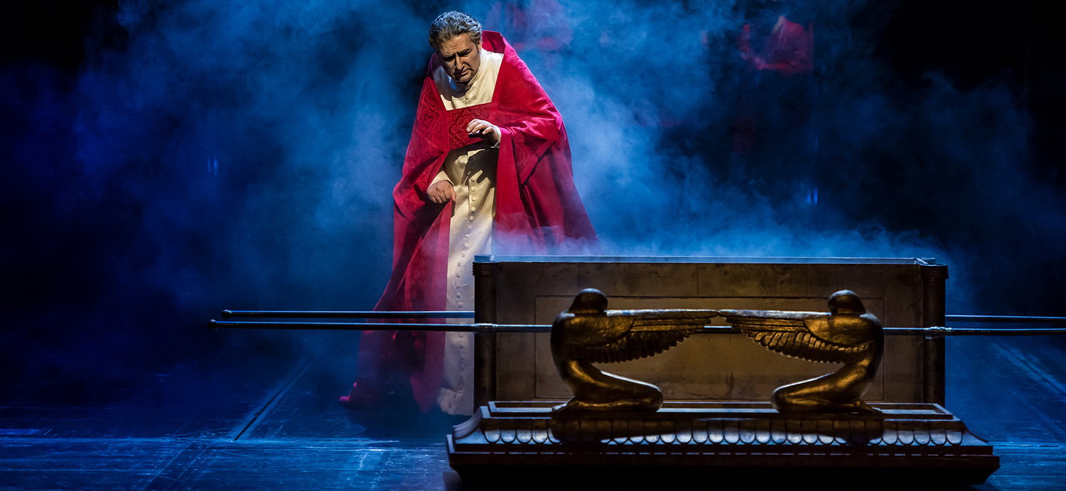 Der Kernsatz seiner Insze­nierung, am Schluss als Projektion einge­blendet, ist Wagners These. „Da, wo die Religion künstlich wird, ist es der Kunst vorbe­halten, den Kern der Religion zu retten.“ Dew folgt dem Prinzip von These und Antithese. Gemeinsam mit dem Regisseur Marcelo Buscaino, der Dews Konzept mit großer Inten­sität in Chemnitz umsetzt, werden durch die ausdrucks­starken und oft mystisch erhöhten und überdi­men­sio­nalen Bühnen­bildern von Heinz Balthes sowie den teilweise abstrakten Kostümen von José Manuel Vázquez und einer subtilen Licht­regie von Matthias Klemm Momente großer drama­ti­scher Dichte erzeugt. Dazu zählt auch ein riesiges, langsam nach oben schwen­kendes Weihrauchfass sowie der Aufzug der Grals­ritter mit gut 20 in blau und später rot leuch­tenden Lanzen, die die Überreste des Grals­tempels symbolisieren.