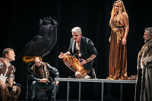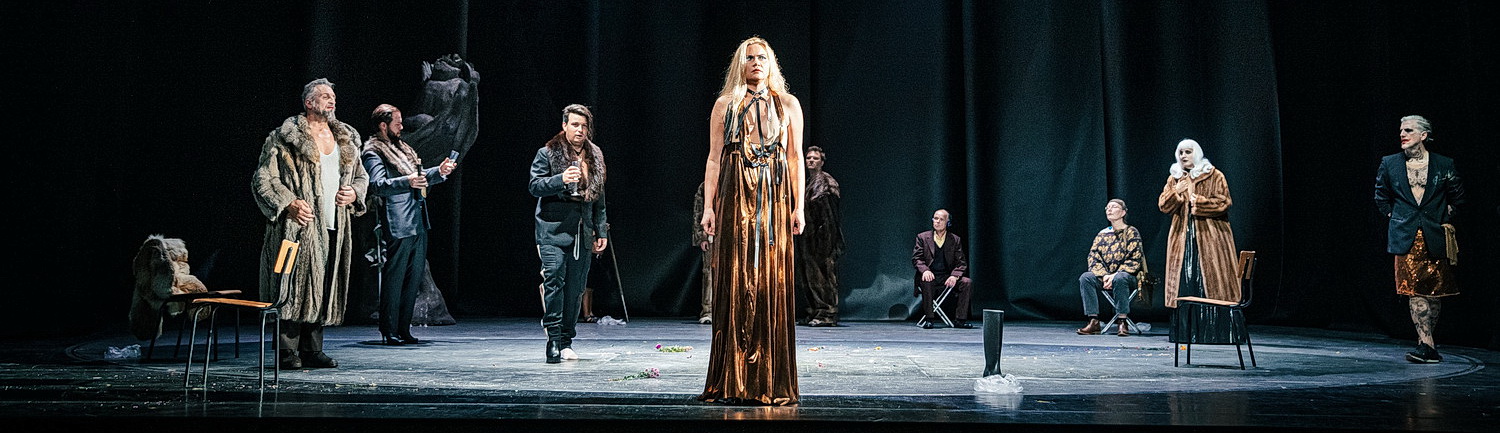 Die Götter sind dekadent charak­te­ri­siert, eine Prosecco schlür­fende Gruppe von Charak­teren, die illuster daher­kommen und doch nicht wirklich was zu sagen haben. Wotan wirkt wie ein Trapper, der erfolglos von der Bärenjagd zurück­kommt. Donner, im seidenen Tuch mit Stöckel­schuhen und einem winzigen Hammer, mit dem man noch nicht mal einen Sturm im Wasserglas entfachen kann, ist lediglich eine schlechte Karikatur, genauso wie Froh, der aussieht wie ein Remake von Tom Kaulitz von Tokio Hotel. Freia ist die erotische Verspre­chung des Abends, während Fricka sich mit ihrer Perücke abmüht und die genervte Gattin gibt. Loge dagegen ist inter­essant darge­stellt, überzogen mit Tattoos und das Gesicht geschminkt wie Heath Ledger als Joker im Film The Dark Knight. Und das passt tatsächlich irgendwie in diese groteske Ansammlung von Charak­teren, denn dieser dunkle Loge-Joker ist dämonisch, intrigant und manipu­liert Götter, Riesen und Zwerge. Dass er einen Rock aus einer Rettungs­folie trägt, die man bei Brand­ver­letzten einsetzt, hat schon wieder Stil. Während die Riesen in ihren Fellen wie Urzeit­men­schen daher­kommen, ist Mime ein wie unter Ecstasy stehender Derwisch, der zu den Schlägen der Ambosse einen gesteppten Veitstanz aufführt. Und Erda, die Urmutter, die Allwis­sende, die Wala? Sie ist eine der Zuschaue­rinnen des Museums, eine Menschenfrau, die alles beobachtet hat. Für Müller-Elmau perso­ni­fi­ziert Erda die Natur­kraft, die jegliches Leben entstehen lässt und in allem wirkt und daher in unter­schied­lichen Formen erscheinen kann. Klingt sehr esote­risch, ist aber am Wagner­schen Verständnis vorbei­ge­schrammt. Dass Müller-Elmau durchaus Kenntnis und Verständnis der Motive im Ring hat, sieht man quasi aus dem Augen­winkel im Hinter­grund. Wenn Wotan zu seinem letzten Monolog ansetzt, erklingt das erste Mal das Schwert­motiv, und hier schon scheint sich, wissend um das drohende Ende der Götter, sein großer Gedanke zu entwi­ckeln, nämlich das Schwert für seinen noch nicht gezeugten Sohn Siegmund in den Stamm der Esche zu rammen. Und Erda, die unscheinbare Museums­be­su­cherin, hat plötzlich das Schwert in der Hand und gibt es einer anderen Besucherin weiter. Der Raben­junge als Begleiter Wotans ist auch nur eine halbherzige Allegorie.
