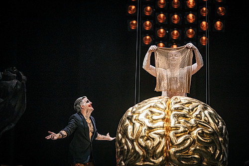 Dass beobach­tende Menschen im Ring in das Geschehen direkt oder indirekt eingreifen, ist nun auch nichts neues, Patrice Chereau hat es in seinem Bayreuther Jahrhundert-Ring 1976 eindrucksvoll gezeigt. Neben dieser nicht wirklich überzeu­genden Perso­nen­regie ist Müller-Elmau auch für das Bühnenbild verant­wortlich, dass in der ersten Szene noch inter­essant wirkt, dann aber von Szene zu Szene nachlässt. Das große, goldene Hirn im Zentrum, und Alberichs Verwandlung in einen Drachen zeigt das Gehirn mit einer Art Rückenmark, und der ständige Wechsel von Erd- und Mondsil­houette, das sind schon die nennens­werten Effekte, die Markus Stretz mit seinem Licht­design gut in Szene setzt. Der Einzug der Götter in Walhall ist ein enges Zusam­men­rücken der Götter auf einem Podest, angestrahlt von einer Batterie Schein­werfer. Auch das wirkt profan, kann weder begeistern noch verärgern. Die schon beschrie­benen Kostüme hat Julia Kasch­linski entworfen.
