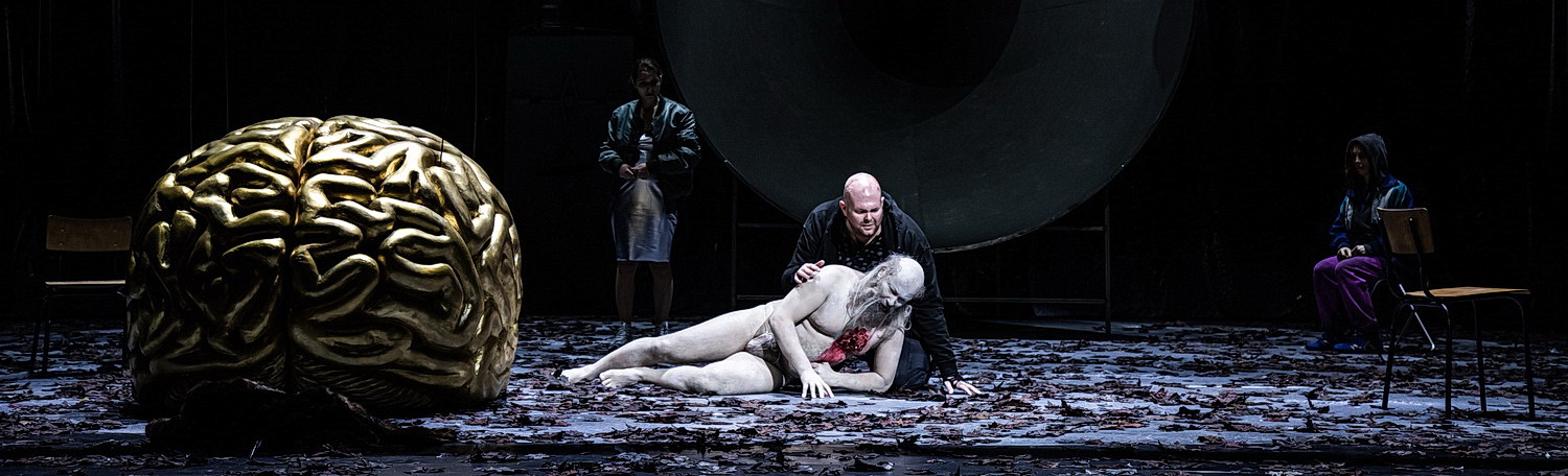 Der zweite Aufzug spielt ja bekann­ter­maßen im Wald vor Fafners Neidhöhle. Die ist ein großer Parabol­spiegel, auf dem Boden liegt Alberich zwischen welken Blättern, und eine der unver­meid­lichen Besuche­rinnen wirft die Blätter auf ihn. Ein Bärenfell liegt noch wie hinge­worfen da. Der andere Besucher, mit einem orange­far­benen Luftballon bewaffnet, beobachtet die Szene genau. Nachdem Wotan den Riesen Fafner aufge­weckt hat, wird der große Spiegel nach oben gezogen, er hat einen riesigen Grammo­phon­trichter verdeckt, aus dem die Stimme Fafners ertönt. Natürlich kommt es im Anschluss nicht zum Drachen­kampf, statt­dessen wird von der Decke ein überdi­men­sio­niertes goldenes Gehirn herun­ter­ge­lassen, was wir, nur in kleineren Ausgaben, schon aus Rheingold und Walküre kennen. Das Gehirn wird Siegfried überge­stülpt, und er schießt mit seiner Nothung-Pistole in das Gehirn und tötet damit den Wurm Fafner. Diese intel­lek­tuelle Trans­fer­leistung muss man erst mal vollbringen!