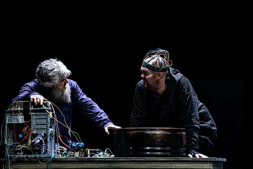 Es bleibt nun die spannende Frage offen, wie Müller-Elmau die Konzeption seiner ersten beiden Insze­nie­rungen im Siegfried weiter­führen wird. Zumindest in dieser Frage bleibt er stringent und konse­quent. Im ersten Aufzug sehen wir zu Beginn die schon aus den vorhe­rigen beiden Abenden der Tetra­logie bekannten Besucher, die sich neugierig in der musealen Hütte Mimes umsehen, die aller­dings nichts weiter als ein von innen beleuch­tetes Zelt ist. Vorne ein vermüllter Schreib­tisch mit einem geöff­neten alten Computer, auf dem Stuhl sitzt einer der Zuschauer und begut­achtet den ganzen Aufbau. Als Mime dann die Szene betritt, setzt er sich auf einen Besucher­stuhl und zieht sich einen Kopfhörer über. Ist ihm die Musik zu laut, mag er den Gesang nicht? Wir wissen es nicht. Eine zweite Besucherin scheint eine Kritik zu schreiben. Sie macht sich gelegentlich Notizen, fotogra­fiert die Szene mit dem Handy. Für die Handlung selbst sind diese Figuren überflüssig und lenken nur unnötig ab, aber das ist in diesem Ring-Konzept nichts Neues. Mime, von großer Statur und wahrlich kein Zwerg, ist mit grauem Wuschelhaar, langem Bart und tänzelndem Auftritt so eine Art Catweazle wie aus der gleich­na­migen briti­schen Comedy-Serie. Kein weiser Schmied, wie ihn der Wanderer so treffend bezeichnet. Die Schmie­de­ge­räusche, die oft in der Mime-Szene mit einem Hammer auf einem Metall­stück durch den Darsteller selbst erzeugt werden, kommen aus dem Orches­ter­graben. Siegfried ist in seinen herun­ter­ge­kom­menen Klamotten und seinem fast schon debilen Auftreten eher der Typ Klein­kri­mi­neller in sozialem Brenn­punkt. Auf dem Kopf trägt er einen Metallreif mit Elektroden, die in ein Kabel münden, das Mime dann an seinen Computer anschließt. Eine der wenigen durchaus inter­es­santen Ideen, dass Mime Siegfried mittels neuro­phy­sio­lo­gi­scher Impulse quält und manipu­liert. Gehirn­wäsche vom Allerfeinsten.