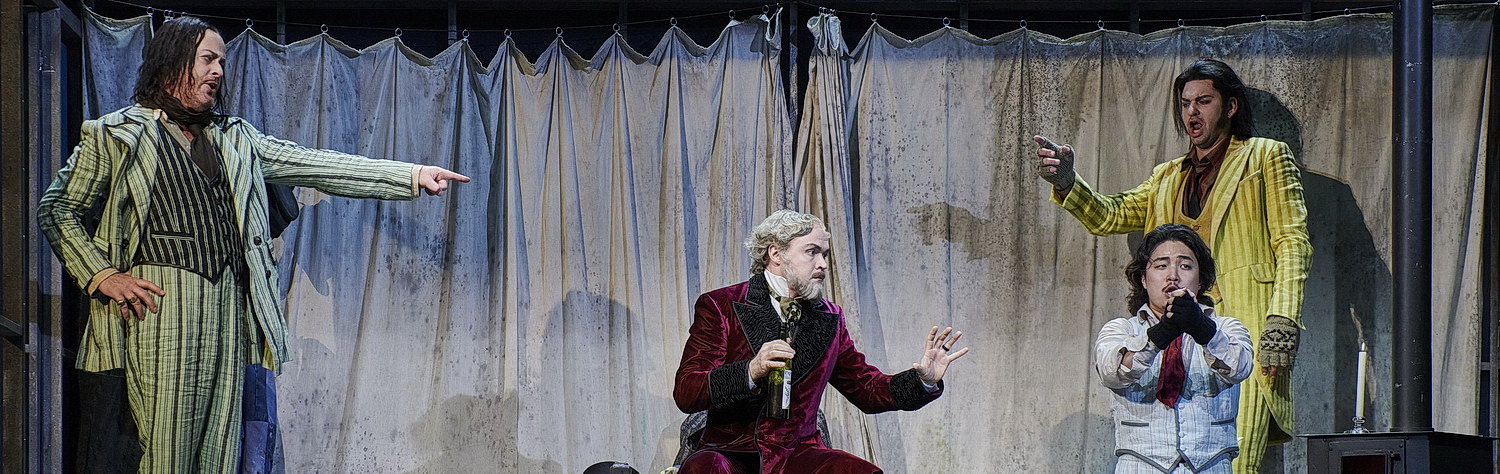 Der Poet Rodolfo, der Philosoph Colline, der Maler Marcello und der Musiker Schaunard führen hier ein unbeschwertes, aber auch an Entbehrungen und Enttäuschungen reiches Leben. Ihr Zuhause erinnert mit Bett, Badewanne, Kohleofen eher an eine Haltestelle für Busse und Bahnen. Sie pflegen einen frivolen bis sarkastischen Umgangston. Deutlich wird das insbesondere in der Geschichte vom vergifteten Papagei, die Morgan Moody in der Rolle des Schaunard als derben Spaß erzählt. In ihrer Lebensfreude lassen sie sich nicht stören, als der Vermieter Benoît die Mansarde betritt, um die rückständige Miete zu kassieren. Mit anzüglichen Scherzen komplimentieren die Freunde ihn hinaus. Ian Sidden spielt ihn mit der Einsicht des Alten, der gewohnt ist, bei der jungen Generation aufzulaufen.