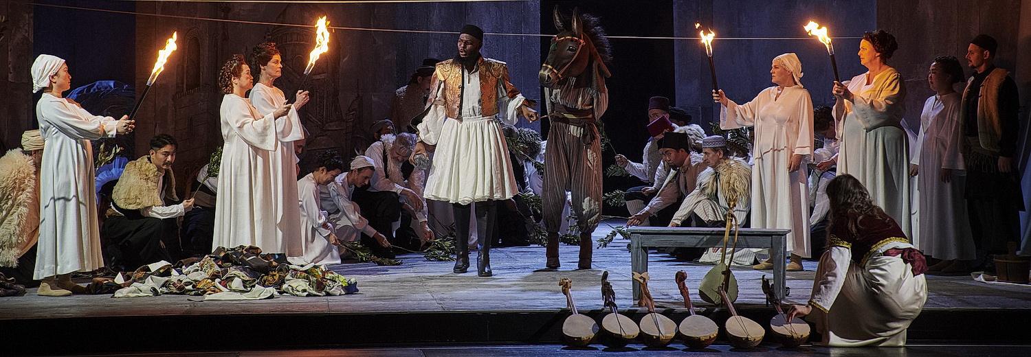 Das Sänger­ensemble besticht bei wenigen Abstrichen durch Inten­sität, Vehemenz und Aufbietung aller physi­schen Kräfte. An der Spitze die drei Protago­nis­tinnen mit der hinrei­ßenden Mezzo­so­pra­nistin Aude Extrémo in der Partie der Yamina, der Sopra­nistin Anna Sohn als ihre Rivalin Héléna und der Mezzo­so­prnistin Alisa Kolosova als Dara. In den Partien der Männer imponieren Sergey Radchenko als Mirko mit einer Tenor­gewalt, die keine Grenzen zu kennen scheint, sowie der Bariton Mandla Mndebele dem eine packende Gestaltung des Aslar gelingt. Ihn eint freilich das Manko einer phasen­weise unruhigen Intonation und eines unnatür­lichen Vibratos mit dem Bass Denis Velev in der Rolle des Père Sava, des höchsten Dorfgeist­lichen. Schlicht phäno­menal ist die Perfor­mance von Opernchor und Projekt-Extrachor in der Einstu­dierung von Fabio Mancini.