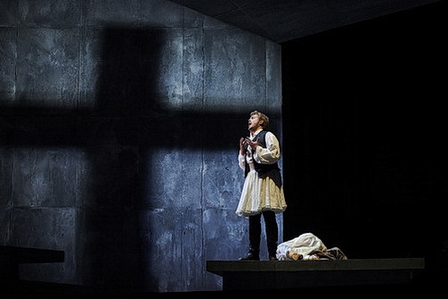 Der Mix an Stilen findet sich auch in der Ausstattung. Frank Philipp Schlöß­manns Bühne beschränkt sich im ersten Akt auf einen nüchternen in Grau gehalten Raum, in dessen Wände Konturen von Kirchen mit Zwiebel­türmen wie eingra­viert zu sehen sind. Von Szene zu Szene wird das Panorama bunter. Strecken­weise auch kitschig, wenn Schnee auf die Liebenden hernieder rieselt, die sich auf dem legen­dären schwarzen Berg umarmen. Und krass überzeichnet, wenn im Finale die Wiedergabe eines Wandta­bleaus mit einem schla­fenden Kind den Frieden der Brüder sugge­riert, den die beiden im Tod gefunden haben wollen.