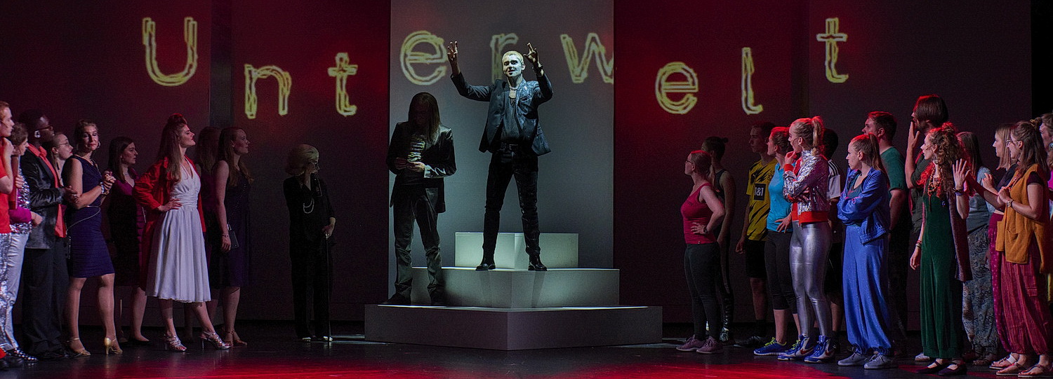 Die gesanglichen Qualitäten fallen natürlich unterschiedlich aus. Lilli Schnabel als Eurydike, Sarah Heckner als Venus und Lina Förster als „Öffentliche Meinung“ stechen ein wenig aus dem insgesamt hochmotivierten Ensemble heraus. Und Felix Kriewald in der Rolle des Orpheus glänzt nicht zuletzt mit vorzüglichen Geigensoli. Besonders erfreulich, mit welcher Präzision das vom Schulorchester unterstützte Projektorchester unter Leitung von Christoph JK Müller die dreistündige, dennoch kurzweilige Produktion in Schwung hält.
