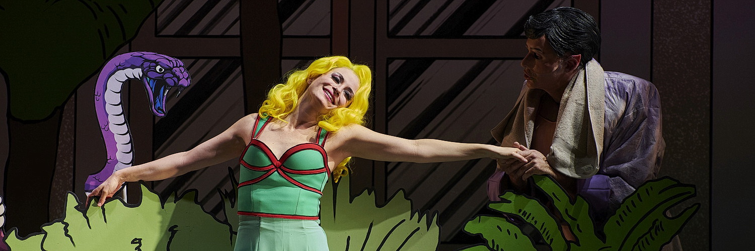 Habjan bettet die Handlung in ein aufwändig gestaltetes Comic-Szenario. Eurydike wird in einer Wellness-Oase von dem inkognito als Bademeister agierenden Unterwelt-Boss Aristeus alias Pluto umschwärmt, von ihrem geigenden Gatten genervt und letztlich von der Schlange gebissen. Das Orchester ist dekorativ im Pool postiert. Beim Einzug in den Olymp und später in die Unterwelt beschwört Habjan antike Bilderwelten, hell im Elysium, dunkel im Hades, angereichert mit zahlreichen witzigen Anspielungen auf Comic- und Film-Stereotypen, wenn etwa Hans Styx in Gestalt einer Nosferatu-Kopie seine verlorengegangene Attraktivität beklagt. Diana stößt markant ins Horn, Cupido hüpft federleicht wie eine Putte über die Bühne und Venus ist sich ihrer Schönheit bewusst.