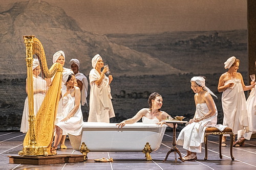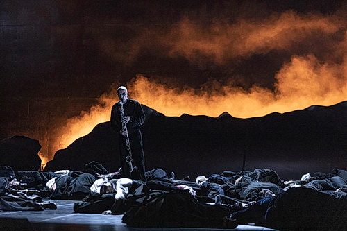 Kana Takenouchi an der Querflöte und Aline Khouri an der Harfe dürfen als Hofmusikerinnen auf der Bühne Marguerite de Valois bei ihrem Bad unterhalten, während Christoph Korn mit seinem wie ein Klagelied vorgetragenen Bassklarinetten-Solo den großen Schlusspunkt nach vier Stunden setzen darf.