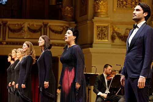 Puccinis japanische Tragödie Madama Butterfly ist die Charak­ter­studie einer jungen Frau, die sich um der Liebe willen von alten Tradi­tionen und Werten trennt, um am Ende doch bitter erkennen zu müssen, dass alles Warten auf den Geliebten vergebens war und sie willfäh­riges Opfer einer fremden Kultur geworden ist. Wenn ein eingän­giges Bühnenbild und eine gute Perso­nen­regie fehlen, können die Gefühle und Emotionen nur durch die Musik und den Gesang übertragen werden. Und das gelingt an diesem Abend in Vollendung, frei von allen Zwängen, die Regie und Bühne sonst den Sängern aufer­legen.  Allen voran Hrachuhí Bassénz als Cio-Cio-San mit einem furiosen Rollen­debüt. Sie verkörpert die Rolle der Madama Butterfly voller Leiden­schaft und Emotionen. Die lyrischen Momente singt sie innig und teilweise mit zartem Piano, die drama­ti­schen Ausbrüche und die strah­lenden Höhen sind bravourös. Ihr geschmei­diger Sopran ist ideal für Puccinis Klangbild, da gibt es keine Brüche im Wechsel von Höhen und Tiefen. Zu Recht erhält sie langan­hal­tenden Szenen­ap­plaus nach ihrer großen Arie Un bel di vedremo. Auch in dem großen Liebes­duett im ersten Akt harmo­niert ihre Stimme wunderbar mit dem ebenfalls ausdrucks­starkem Tenor von Jonathan Tetelmann in der Rolle des B. F. Pinkerton. Sein strah­lender Tenor übertönt das Orchester mit Leich­tigkeit, die Höhen kommen mit schein­barer Leich­tigkeit, erzeugen dabei wohlklin­gende Phrasen. Sowohl das Liebes­duett im ersten Akt als auch das Abschiedslied im dritten Akt vollenden das wunderbare Gesangsbild. Die herzzer­rei­ßenden Schlussrufe Pinkertons von der Hinter­bühne sind erschüt­ternd und veredeln ein grandioses Finale.
