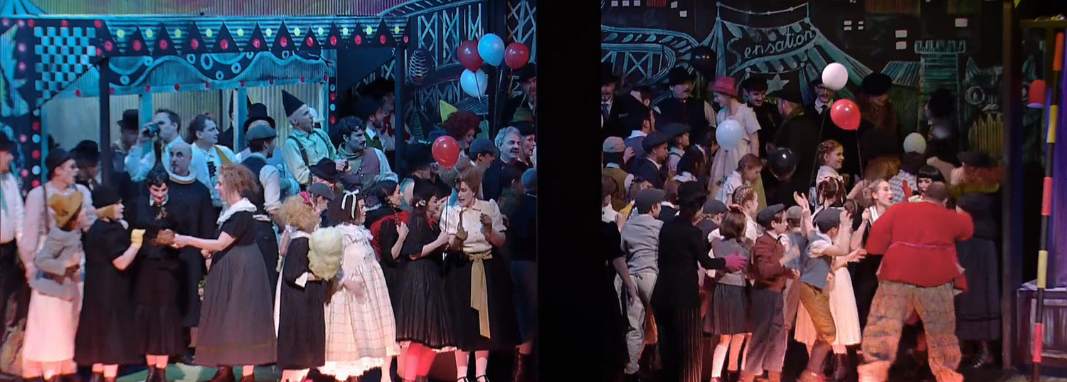Stölzl wählt wieder eine filmische Erzählweise mit emotionalen Nahaufnahmen und Parallelmontagen wie in der Cavalleria rusticana und siedelt die Oper ebenfalls im Italien der 1920-er Jahre an. Auch in dieser Oper geht es um Liebe, blinde Eifersucht und Hass bis zum Tod. Das Bühnenbild hat sich von der Raumaufteilung in zwei Ebenen mit jeweils drei guckkastenartigen Räumen, die sechs gleichgroße Räume abbilden, die separat geöffnet und geschlossen werden können, nicht verändert. Durch die zusätzlichen Live-Einblendungen im Großformat wirkt die Szenerie wie ein Film mit expressionistischen Materialien. Die Bühnenwände wirken wieder wie gemalt, doch farblich ist es deutlich bunter geworden, passend zum Zirkusmilieu. Durch die Trennung der sechs verschiedenen Räume können parallel Zirkusbühne, Wohnwagen, Zuschauerraum und Hintergrund abgebildet werden. Leoncavallos Wunsch war es, eine größtmögliche Wahrhaftigkeit der Handlung zu erzielen, obwohl er wusste, dass Theater die Wirklichkeit nur abbildet, aber nicht erreichen kann. Mit seiner Raumaufteilung und den großformatigen Videoeinblendungen lässt Stölzl den Zuschauer unmittelbar am Geschehen teilhaben. Durch die geschickte Videoregie von Altmeister Brian Large ist man als Fernsehzuschauer so dicht an einzelnen Szenen dran, wie man es in einem großen Opernhaus selten sein kann. Es fehlt zwar das Live-Erlebnis, was auch nicht ersetzbar ist, aber durch die cineastische Kameraführung ist diese Aufführung großes Kino! Die bunten, etwas überdrehten Kostüme zu diesem Szenar hat wieder Ursula Kudrna gefertigt.