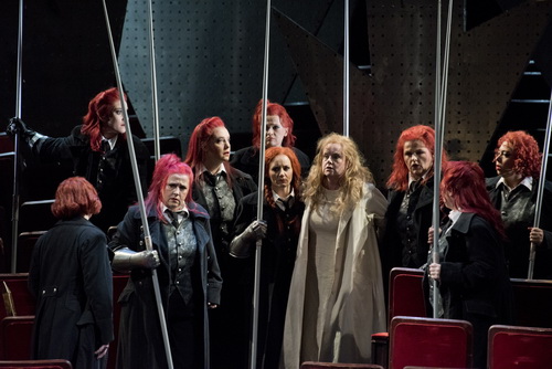 Der Walkürenfelsen ist jetzt ein großer Raum, hinter dessen Vorhang wieder die Theaterstühle zu erkennen sind mit den acht Walküren, die das Geschehen um ihre verbannte Schwester interessiert beobachten. Das der Waldvogel in der Kindesgestalt Siegfrieds in dieser Szene noch präsent ist, ist eine von zahlreichen sehr freien Interpretationen Deckers, die man nicht unbedingt goutieren muss. Auch das elegante feuerrote Kleid, das Brünnhilde trägt, unterscheidet sich deutlich von der heroinischen Kleidung, in der sie am Schluss der Walküre in „festen Schlaf“ verschlossen wurde. Dennoch gerät die Schlussszene zu einem großen emotionalen Moment, der aber auch Brünnhildes geistige Überlegenheit deutlich herausstreicht.