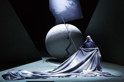 Und das Waldvöglein hat hier eine doppeldeutige Rolle, in der Kindesgestalt Siegfrieds wird es nicht nur zum Wegbereiter des weiteren Handelns, sondern symbolisiert auch die Entwicklung Siegfrieds, der ohne echte Vaterfigur aufgewachsen ist und von Mime nur auf zum Töten Fafners instrumentalisiert wurde. Im dritten Aufzug des Siegfried gibt es dann durchaus einen Bruch in der Inszenierung, was aber mit der Entstehungsgeschichte des Rings und der kompositorischen Unterbrechung des Siegfried durchaus im Einklang steht. Die „Erda-Szene“ gelingt hier sehr eindrucksvoll, die alten Machtpositionen sind vordergründig wiederhergestellt. Wotan steht vor einer nunmehr rissigen Weltenkugel. Erda ist blind, ihr Wissen ist geschwunden, und auch Wotan in der Gestalt des Wanderers bäumt sich ein letztes Mal gegen sein eigenes Ende auf, obwohl er es so herbeisehnt. Nachdem Siegfried Wotans Speer zerschlagen hat, ist der Weg zu Brünnhilde frei.