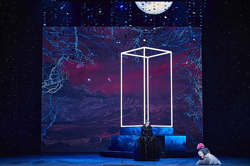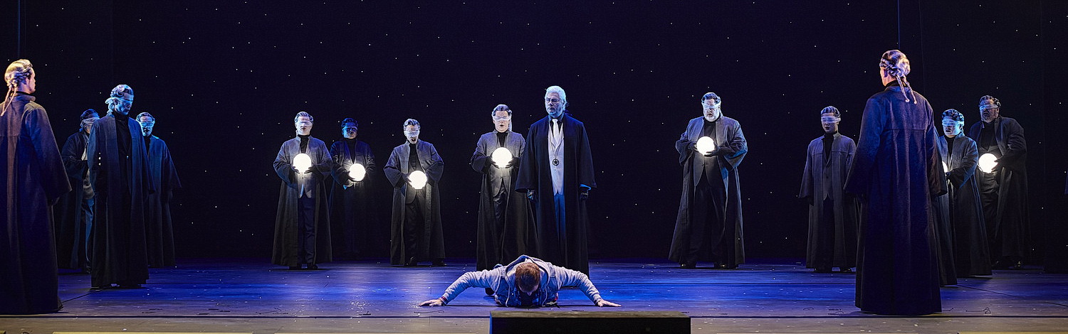 Köpplinger erzählt die Zauber­flöte aus der Sicht eines Teenagers, dem jungen Tamino. Es ist eine Geschichte vom Erwach­sen­werden, eine Geschichte von Abenteuer, Freund­schaft und Prüfungen. Köpplinger bedient sich sowohl der Elemente der kindlichen Märchenwelt als auch der modernen Fantasy-Welt von Teenagern und jungen Erwach­senen, wie sie in den Marvel-Comics auf der ganzen Welt gelesen werden. Und diese Verbindung schafft ein genera­tio­nen­um­span­nendes Band und macht diese Insze­nierung zu einem abenteu­er­lichen Opern­erlebnis für Jung und Alt. Zu den Klängen der Ouvertüre ist die Bühne leer, ein Junge im Teenager­alter, in Pullover mit Jeans­weste und Holzfäl­lerhemd läuft suchend über die Bühne, während sich von der Decke ein Sternen­himmel herab­senkt. Es erscheint ein blau illumi­niertes Seil von der Bühnen­decke, kurz darauf ein zweites, goldfar­benes von der anderen Seite. Der Junge hält beide Enden in der Hand, als wolle er sie verbinden. Dann erscheinen Sonne und Mond gemeinsam von der Bühnen­decke, während schwarz­ge­kleidete Gestalten dem Jungen die Seile wieder entwenden und Sonne und Mond wieder verschwinden. Während die fast unsicht­baren Gestalten mit den beiden Seilen einen wilden Tanz auf der Bühne aufführen und den Jungen über die Bühne jagen, wird im Hinter­grund eine Stein­wüste proji­ziert, aus der ein Baum wächst. Der Junge verschwindet hinter der Seiten­bühne, um kurz darauf als erwach­sener Prinz Tamino zurück­zu­kehren, womit die eigent­liche Handlung der Zauber­flöte beginnt.