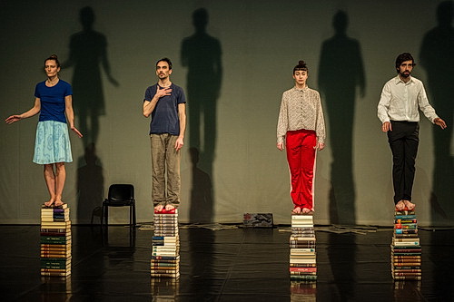 Grega Zorc, Anita Wach, Vito Weis, Kristina Aleksova, Loup Abramovici und Nataša Živković schonen sich keine Sekunde, um die originellen Einfälle, die nie zum Slapstick geraten, reihenweise auf die Bühne zu bringen. Ob als fallende Ballerina, Bergsteiger oder aus dem Ruder gelaufenes Model wechseln sie permanent die Kostüme, besteigen Stühle, Leitern, Bücherstapel oder verharren in grotesken Situationen auch schon mal minutenlang in völliger Erstarrung. Versuchte Tabubrüche wie die Zigarre im entblößten Hintern oder das lustvolle Zerfleddern von Buchseiten können heute niemanden mehr erschrecken, trotzdem bleibt so manchem Zuschauer bei anderer Gelegenheit, hinter der er zunächst einen Schenkelklopfer vermutet, das Lachen verunsichert im Halse stecken. Stundenlang könnte man diesem teils zirzensischen Treiben zuschauen, gäbe es da nicht jenen erschreckenden Moment, in dem Flüchtlinge ihre Schuhe zurücklassen. So banal ist das Grauen.