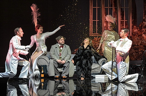 Regisseur und zugleich Ausstatter Gianluca Falaschi verlagert die 1780 spielende Handlung denn auch in eine Hollywood-reife Szenerie mit viel Glitzer, dunkelt den Raum jedoch geschickt ab, wenn persönliche Konflikte angesagt sind. Die Personenführung wirkt freilich nicht ausgereift. Während die Chorszenen revue-artig agil ausgeführt werden, verlässt sich der Regisseur bei der Personenführung zu stark auf die Ausstrahlung der Solisten. Daran mangelt es dem vorzüglichen Ensemble zwar nicht. Aber wer nicht gerade singt, steht oder sitzt mehr oder weniger teilnahmslos herum. Selbst in der Schlussszene sieht Maurizio dem Todeskampf seiner Geliebten unbewegt aus der Distanz zu.