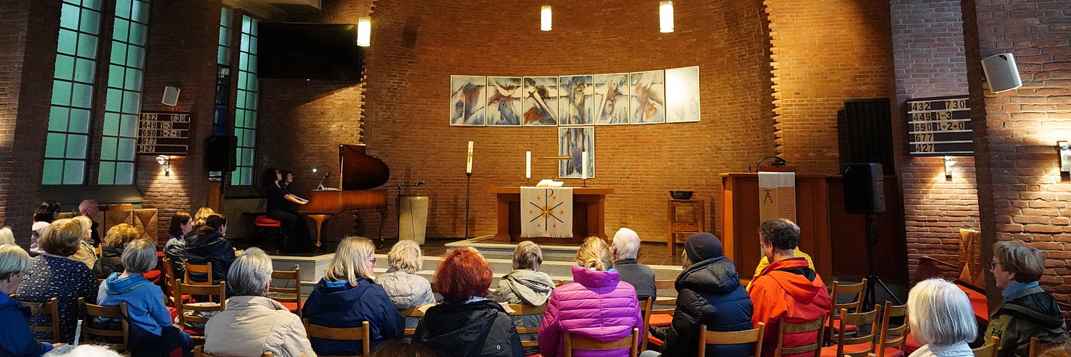 Und die beiden Pianistinnen geben alles. Es gelingt ihnen tatsächlich, dem Flügel warme Klänge in akzeptabler Lautstärke zu entlocken. Golkhovaya verrät später erschöpft, dass das nur durch maximalen Energieaufwand zu erreichen ist. Für das Publikum im gut besuchten Kirchenraum bedeutet das Klanggenuss vom Feinsten. Und schmunzelnd hört es sich die Anekdote von Seropian über die Unterrichtsmethoden von Wolfgang Amadeus Mozart an, der gern im vierhändigen Übungsspiel Fehler einbaute, um die Konzentration seiner Schülerinnen zu testen. Dazu eigneten sich unter anderem die Variazioni in G‑Dur über ein eigenes Thema, die Mozart im Alter von 37 Jahren komponierte. Daraus präsentieren die Musikerinnen das Andante. Es folgt die Prozession Cortège von Claude Debussy.