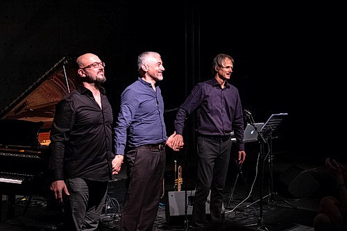 Auf Anregung von Markus Stockhausen, sagt Vuletić, stellt er die „beschriebenen“ Personen und ihre Schicksale jeweils kurz vor. Die Gruppe der nächsten vier Menschen beginnt mit einem Trompetensolo. Dabei und in der Folge setzt Stockhausen auch immer wieder ein Masterkeyboard ein, um mit Verfremdungseffekten wie Hall oder Echo zu arbeiten. Dass er zwischendurch auch den Flügelkasten als Resonanzraum nutzt, erzeugt ein besonders schönes Echo der Saiten. Später wird er auch noch die eigene Stimme zur Tonerzeugung nutzen. Vorerst aber geht es um Malala Yousafzai, der inzwischen weltbekannten Kinderrechtsaktivistin und jüngsten Friedensnobelpreisträgerin, die einen Kopfschuss durch einen Taliban überlebte. Ihr ist das Solo gewidmet, ehe die Musiker sich Harriet Tubman zuwenden, einer afroamerikanischen Fluchthelferin, die bis zum Ende des amerikanischen Sezessionskrieges Sklaven half, aus den Südstaaten zu fliehen. Ebenfalls für ein menschlicheres Dasein setzte sich Dolores Ibárruri ein, die gegen das faschistische Regime in Spanien kämpfte und dabei die Losung „No pasarán“ – Sie werden nicht durchkommen – prägte, um zum Widerstand zu ermutigen. Unter den weiteren Porträts sei Arturo Ui hervorgehoben. Denn den gibt es nicht. Bertolt Brecht schuf die fiktive Person als Stellvertreter für Diktatoren, die sich der Lächerlichkeit preisgeben. Die Ähnlichkeit mit Adolf Hitler war dabei durchaus gewollt. Und hier kann Vuletić es sich auch nicht verkneifen, sein Publikum mit quäkender Trompete zum Lachen zu bringen.