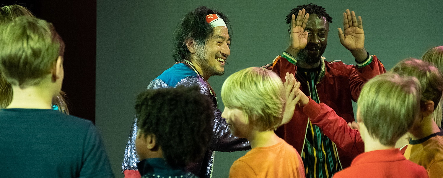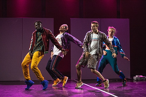 Im Hinter­grund der Bühne sind vier weiße Stell­wände aufgebaut, rechts daneben ist Platz für ein paar Musik­in­stru­mente. Vor den Stell­wänden steht ein Beamer. Mehr braucht es bei Takao Baba und seinem Ensemble nicht, um den Kindern einen sport­lichen Nachmittag zu bereiten. Nach ein wenig Live-Musik zur fließenden Eröffnung schreiten Baba, Felix Küpper und Salomon Quainoo durch die versetzt aufge­stellten Wände, kommen nach vorn, präsen­tieren sich in den Kostümen von Charlotte Grewer, die ein paar klassische HipHop-Klamotten ausge­wählt hat. Zu Careless Whisper gibt es ein Posing, weit von Tanz entfernt. Männer tanzen also nicht? Sieht ganz so aus. Als sie hinter die Stell­wände treten, zeigen sie der Kamera, wie ihre Tanzsprache aussieht. Einfache, klassische HipHop-Bewegungen sind zu sehen. Die Bilder werden vorn auf die Paravents übertragen. Inzwi­schen hat sich auch Jenny Thiele dazuge­sellt, die bislang die E‑Gitarre bedient hat. Die Botschaft ist klar. Das, was hier zu sehen ist, kann doch jeder. Also kann wirklich jeder tanzen? Und macht er es auch?
