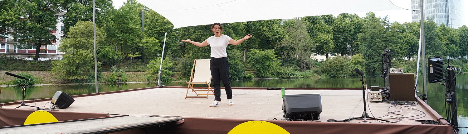 Damit das so ist, braucht es einen wirklich guten Darsteller. Immerhin gilt es, das Publikum für einen 40-minütigen Monolog zu begeistern. Schmidt weiß, auf wen er bauen kann. Schließlich hat sie schon im vergangenen Jahr auf ganzer Linie überzeugt. Ruth Marie Kröger bringt einen Liegestuhl, eine Wasserflasche und das Grundgesetz mit, als sie zur Bühne kommt. Mit weißem T‑Shirt, schwarzer Hose und weißen Turnschuhen wirkt ihr Auftritt sommerlich leicht. Vielleicht ein Grund, warum sie wenig Gebrauch vom Liegestuhl macht. Gefühlt mehrere hundert Meter legt sie an diesem Abend auf und vor der Bühne zurück. Ihr Vortrag ist brillant. Sie weiß, Geschichten zu erzählen. Die Gesten und Pausen stimmen, deklamiert wird hier nicht. Und so macht es Spaß, ihr zuzuhören und zuzusehen, auch wenn die Sachverhalte für juristische Laien ohne jegliche Anschauung schwer nachzuvollziehen sind.