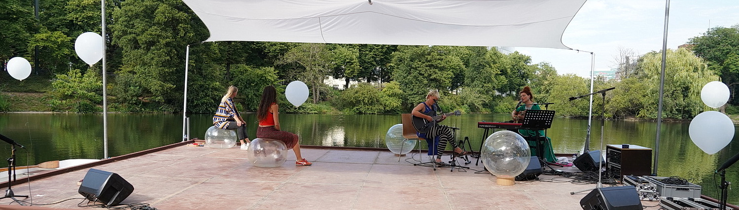 Bei so viel Wohlfühlklima kommt am letzten Tag fast ein wenig Wehmut auf. Das Wetter ist herrlich, die Menschen sind bestens gelaunt. Auch jetzt ist die Tribüne am Kaiserteich wieder bestens besucht. Wie üblich, werden den Besuchern am Platz Getränke angeboten. Auf der Bühne sind ein paar Musikinstrumente mit der nötigen Technik aufgebaut. Um die Bühne herum „schweben“ weiße Luftballons auf dem Teich. Ganz zuletzt steht noch eine Uraufführung auf dem Programm. Erst im vergangenen Jahr hat sich die Gruppe Waltraud900 formiert. Sie besteht aus Künstlerinnen verschiedenster Konvenienz und zeigt auf dem Kaiserteich ihre erste Produktion Grandmothers of the Universe, also etwa Großmütter des Universums. Eine biografische Recherchereise soll es werden, und, betont Seeger-Zurmühlen, lediglich eine Zwischenstation auf dem Weg zum fertigen Stück.