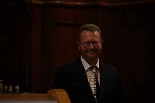 So ein mobiler Spieltisch ist eine großartige Angelegenheit, erlaubt er doch einen Einblick in die Arbeit des Organisten, die oftmals mindestens so interessant wie die Musik selbst ist. Aber wie stellt man ihn auf? Zeigt die Rückseite zum Publikum, sieht man zwar den Kopf des Organisten, aber sonst nicht viel. Stellt man ihn andersherum auf, schaut das Publikum den ganzen Abend lang auf den Rücken des Musikers, hat aber immerhin einen Blick auf seine Fußarbeit, die allein ja schon faszinierend ist. Schollmeyer hat sich für die letztere Variante entschieden. Nach einer kurzen wie herzlichen Begrüßung am Mikrofon, so dass ihn das Publikum von vorne sehen kann, beginnt das Konzert.