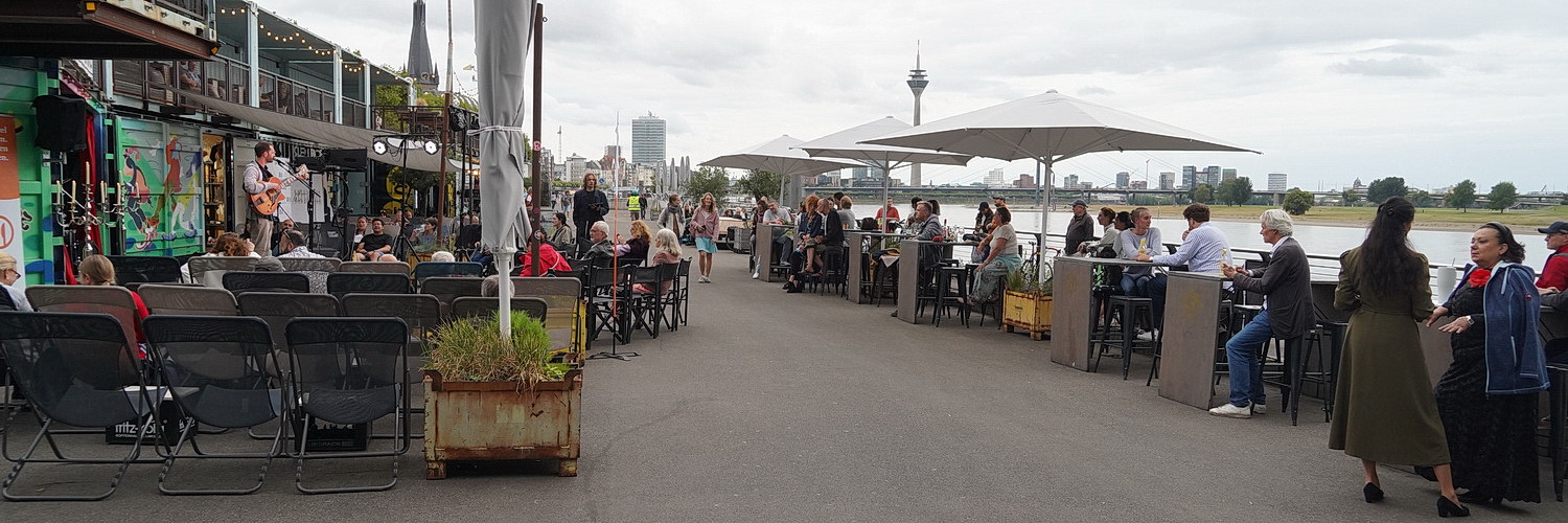 Der Stadtstrand Düsseldorf hat den Sänger und Kulturmanager Thomas Huy beauftragt, im Rahmen der Klassik-Reihe, die er für den Stadtstrand kuratiert, ein Benefizkonzert zu veranstalten, um die Tafel Düsseldorf mit Spenden zu unterstützen. Und, so viel darf vorweggenommen werden, Huy hat sich selbst übertroffen. Ein Blick auf das Plakat zeigt, dass es ihm gelungen ist, zahlreiche Künstler aller Couleur zu gewinnen, die sich, wie im Laufe des Abends zu erfahren sein wird, nur allzu gern pro bono auf die Bühne unterhalb der Oberkasseler Brücke begeben, um die Spendenfreude der Gäste anzuheizen. Die schlechte Nachricht ist, dass der Sommer sich an diesem Abend von seiner grauen Seite zeigt und die Wettervorhersage Regen ankündigt. Da bleiben viele doch lieber zuhause. Die gute Nachricht ist, dass diejenigen, die trotzdem gekommen sind, nach Kräften Scheine in die Acrylbox zu schieben. Zwar sind zwei Wimpel der Tafel vor der Bühne aufgestellt, Huy und seinen Freunden gelingt es aber, eine ausgewogene Balance zwischen Spendenaufrufen und Unterhaltung herzustellen. Das ist sehr angenehm und fördert sicher die Spendenbereitschaft. Schon bald stellt sich eine fast familiäre Atmosphäre ein. Denn nicht nur auf der Bühne tauchen etliche bekannte Gesichter auf, auch im Publikum erkennt man viele Gesichter von Menschen, die man wohl schon als Stammgäste bezeichnen darf.