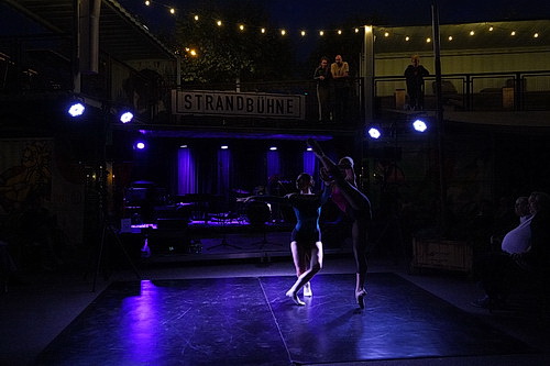 Mit einigen technischen Anlaufschwierigkeiten kann dann der zweite Höhepunkt des Abends beginnen. Denn Huy hat es sich nicht nehmen lassen, dem zeitgenössischen Tanz mit Ballett-Elementen Raum zu geben. Mit Inside the Bubble – Small but Infinite zeigt Karen Yuri bei ihrem Solo, dass es nicht viel Platz braucht, um Tanz zu zeigen, der auch unerfahrene Zuschauer in seinen Bann zieht. Steigern können das eindeutig Alice Hunter und Valeria di Mauro aus der Compagnie von Pascal Touzeau zu dem Stück Piano Piece 1952 des mexikanischen Elektronikmusikers Fernando Corona, der unter dem Namen Murcof auftritt. Seit etlichen Monaten mischt Touzeau mit seinen Tänzerinnen die so genannte Freie Szene auf. Sie lassen keine Möglichkeit aus, Ballett im Alltagsraum zu zeigen und arbeiten permanent an der Erweiterung ihrer Bewegungssprache. Auch für die paar Quadratmeter vor der Bühne des Stadtstrandes finden sie eine neue Choreografie mit Spitzentanz-Elementen, die das Publikum schwer beeindruckt. Schwierig, die beiden Auftritte noch zu toppen.
