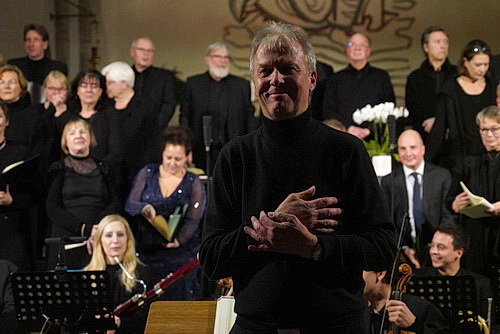 Aber man darf sich davon auch nicht Bange machen lassen. Im Projektchor Düsseldorf haben die meisten Mitglieder in ihre „zweite Heimat“ – das ist der Chor tatsächlich für viele der Laien­sänger – zurück- und inzwi­schen längst die Lust am Singen und an der Begegnung wieder­ge­funden. Hilfreich war dabei sicher, dass das Material schon lange einge­sungen war und nunmehr lediglich aufge­frischt werden musste. Zusätz­liche Unter­stützung haben speziell die Mitglieder des Projekt­chors in der charis­ma­ti­schen Erscheinung ihres Leiters, der sie intensiv auf ein anspruchs­volles Werk vorbe­reitet hat. Damit liegen keine Schwie­rig­keiten vor ihnen, statt­dessen überwiegt die Vorfreude. Zusätz­liche Motivation gab sicher, dass die Spiel­stätte des Projekt­chors erhalten blieb. Und so öffnet die Adolfus-Kirche im Stadtteil Pempelfort gern wieder ihre Pforten für die Fange­meinde, die an diesem Sonntag die Kirchen­bänke füllt.