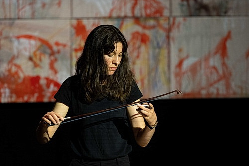 Faust ist nicht allein gekommen. Sie hat die Malerin Charlotte Guibé mitge­bracht, um ein Projekt zu verwirk­lichen, dass die beiden gemeinsam mit dem Kompo­nisten Ondrej Adámek entwi­ckelt haben. Es geht, wie der Name des Programms andeutet, um die Geste, die sich wie eine Klammer um den Abend legt. Guibé nimmt einzelne Bilder von der Wand, um sie unter anderem mit einem Geigen­bogen und flüssiger Farbe weiter­zu­be­ar­beiten, während Faust die Musik von Adámek mit Stücken von Johann Sebastian Bach, Johann Georg Pisendel und Heinrich Ignaz Franz Biber kombi­niert, wenn sie nicht ganz auf das Instrument verzichtet und das Musizieren auf das Gestische reduziert. Die Idee ist nicht neu, früher nannte man solche Veran­stal­tungen Happe­nings. Auch wenn es da schon mal rauer zuging. Hier laufen die Bewegungen ruhig ab, so dass schon fast ein zauber­hafter Eindruck entsteht. Was ein wenig befremdet, ist die Ernst­haf­tigkeit, um nicht zu sagen die Leichen­bit­ter­miene, mit der die beiden Künst­le­rinnen zu Werke gehen. Da freut man sich regel­recht, die beiden nach einein­viertel Stunde auch mal lächeln zu sehen. Nämlich dann, wenn sich das Publikum für die Aufführung sehr herzlich bedankt.