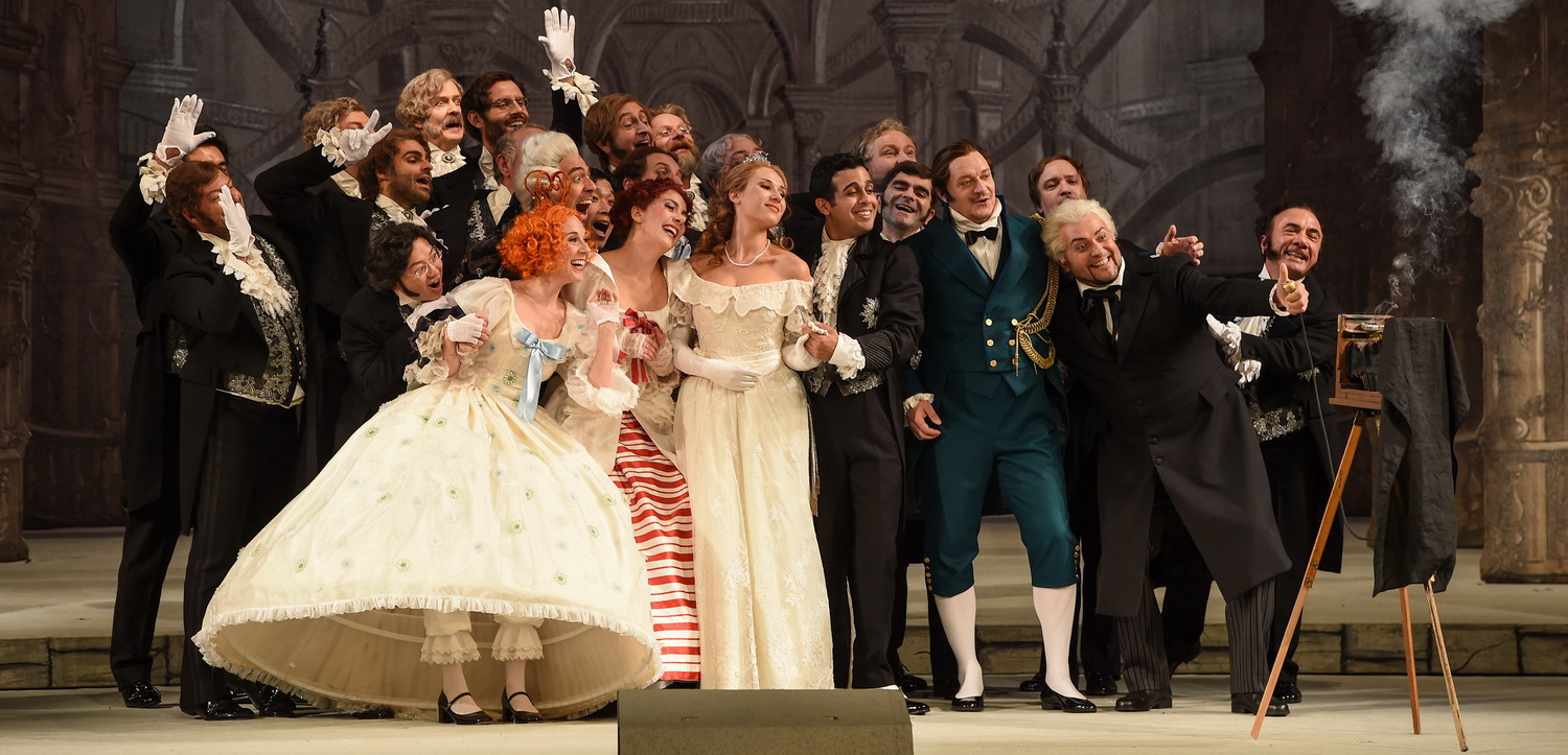 Von Antonio Fogliani und den Düsseldorfer Symphonikern gibt es die passende Untermalung im früh-industriellen Stil. Fogliani schlägt vom ersten Takt der Ouvertüre recht zügige Tempi an, und so rattern die Instrumente mit mechanischer Präzision durch den Abend. Das klingt bei dem versierten Klangkörper freilich nicht nach Stahl und Ruß, sondern nach Champagner und Feuerwerk. Wie so oft in Düsseldorf ist das Forte eine Spur zu laut, so dass man noch den von Patrick Francis-Chestnut einstudierten Herrenchor, der herrlich mitspielt, für vokale Durchschlagskraft hinzuziehen muss.
