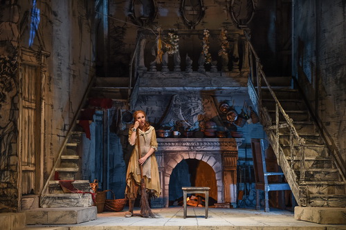 Ein Glück also für die Region NRW, dass Intendant Christoph Meyer weiterhin an dieser Inszenierung festhält und sie 2017 nach zwölf Jahren Abstinenz wieder auf den Spielplan der Deutschen Oper am Rhein zurückgeholt hat. Allein die vielen Details der Kulissen und Kostüme sind ein Besuch der Aufführung wert. Natürlich hat die Puppenhauskulisse von Don Magnificos arg ramponiertem Palast nicht die große Dimension wie an der Scala oder an der Staatsoper, was aber die Personenführung nur noch intensiviert. Ein derartiges dreidimensionales Bühnenbild, das auch die Tiefe der Spielfläche mit perspektivischer Malerei geschickt ausnutzt, ist heutzutage eine Rarität. Sogar ein Einhorn findet sich unter den Verzierungen der fürstlichen Fassade von Don Ramiros Palast wieder. Es ist eben ein Märchen, auch wenn es in der Version Rossinis und in der Inszenierung Ponnelles sehr bodenständig und ohne eine gute Fee auskommt. Als höhere Macht wird von Strippenzieher Alidoro, dem Berater des Prinzen, ein allgütiger Gott angerufen, in dessen Auftrag er handelt. Ansonsten geht es allzu menschlich und sehr komisch daher, wenn sich die bösen Stiefschwestern Clorinda und Tisbe samt ihrem aufgeblasenen Vater Don Magnifico für einen vermeintlichen Prinzen in Szene setzen wollen, sich dabei hoffnungslos lächerlich machen und dabei auch noch dem wahren Prinzen auf die Füße treten. Die legendären Momente der Regie – wie das geifernde Warten auf das Buffet oder Dandinis und Magnificos Kämpfchen um einen Stuhl – funktionieren nach 40 Jahren immer noch mehr als gut. Natürlich sind – und da kann man Spielleiter Volker Böhm keinen Vorwurf machen – einige Abläufe mittlerweile etwas mechanisch und verwässert. Noch dazu stellt die Bühnentechnik während der Gewittermusik etwas zu schnell wieder auf eitlen Sonnenschein um. Aber diese Kleinigkeiten tun einer wirklich sehr sehenswerten und unterhaltsamen Aufführung keinen Abbruch.