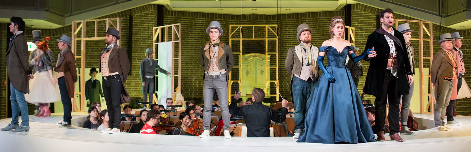 In diesem Jahr hat die Regisseurin mit Lukas Kretschmer eine Bühne entwickelt, von der ihr jeder „Fachmann“ schon im Vorfeld sagen kann: Das wird nichts. Kretschmer hat gemeinsam mit den Bühnenarbeitern der Deutschen Oper am Rhein Düsseldorf Duisburg, die das Projekt der Opernklasse auch in diesem Jahr wieder bei Bühne, Kostüm und Technik unterstützt, einen kreisrunden Wall um das Orchester gebaut. Auf dieser Mauer gibt es Türrahmen-Konstruktionen, die man besteigen und verschieben kann. Handwerklich eine Meisterleistung, bühnentechnisch diskutabel. Zwar können so leichterdings immer neue Räume geschaffen werden, und das geschieht auch, aber wo eine Tür zugeht, ist der Gesang weg. Zumindest wenn man auf der anderen Seite der Tür sitzt. Das Publikum sitzt an drei Seiten des Kreises. Die Rückseite bleibt den Einsätzen des Bühnenpersonals als Wartezone vorbehalten. Die Bühne bricht also das Guckkasten-Prinzip auf. Die Sänger müssen sich auf allen Positionen der Mauer abarbeiten. Die Gesangsfetischisten schnauben schon in der Pause. Denn wenn die Sänger auf der abgewandten Seite des Rings singen, sind sie so gut wie nicht mehr zu hören. Das Publikum auf der zugewandten Seite ist begeistert von der Nähe und dem „Live-Erlebnis“. Allerdings sorgen gut einsehbare Übertitel dafür, dass niemand den Faden verliert. Und wenn du dann dein persönliches Ständchen eines angehenden Opernsängers zu hören bekommst, seinen Schweiß von der Stirn spritzen und die genau probierten Abläufe siehst, die detailliert bis in die Blickrichtung gehen, ist das schon ein ganz besonderes Erlebnis. Und genau bis in diesen „Augenblick“ hinein geht die Personenführung der Regisseurin. Dazu gehören natürlich zwei Seiten. Die Anweisungen von Hartmannshenn genauso wie die Menschen, die bereit sich, sich auf solche Finessen einzulassen. Etwas großzügiger geht es bei den Kostümen zu, die Stefanie Salm entwickelt hat. Einerseits budgetbedingt, andererseits ohne größere Ambitionen, was die historische Genauigkeit angeht. Es sind mehr Accessoires, die auf eine Vergangenheit hindeuten, soweit sie für das Verständnis der Handlung notwendig sind. Ansonsten gibt es auch gern mal Jeans – und Turnschuhe. Da freut man sich geradezu, dass wenigstens für die Damen anständiges Schuhwerk zur Verfügung steht.